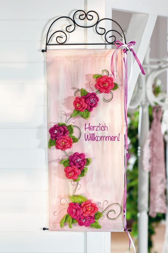 This instruction combines painting on canvas with crocheting of enchanting flowers. With a little bit of skill you can create in no time at all a noble decorative canvas with especially vivid flowers.