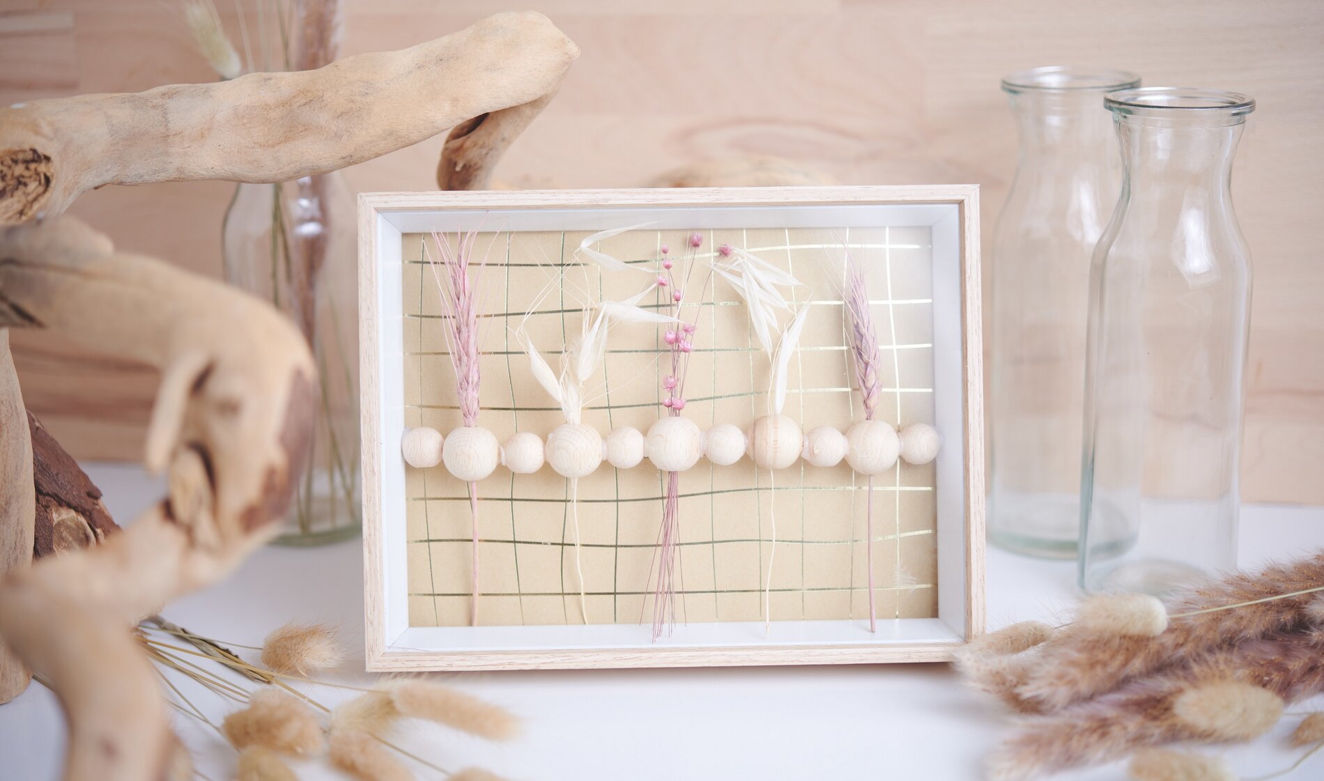 1. Glue together wooden balls of different sizes, as wide as the inside dimension of the frame. Make sure that the holes point upwards and downwards so that you can put the dried flowers through them later.