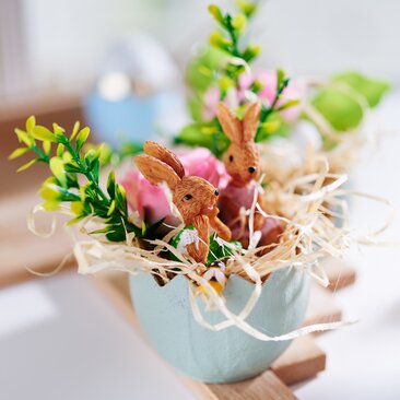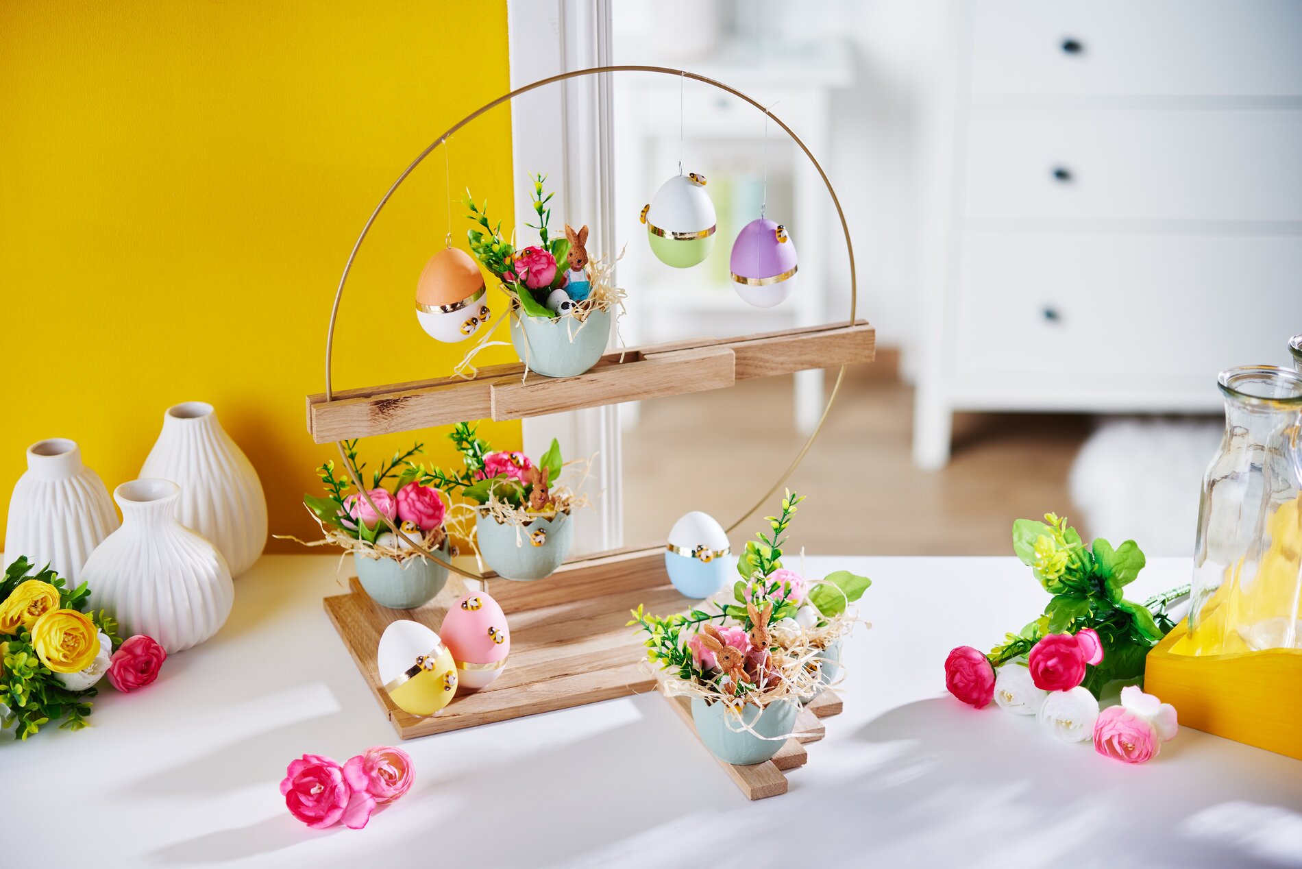In this Easter table decoration, craft blocks are combined with a metal ring and elegantly designed decorative eggs to create an absolutely trendy eye-catcher with that special something.