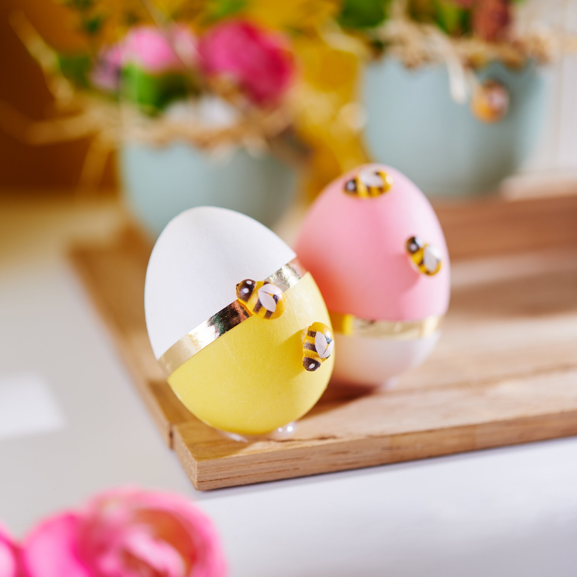 For the floral decoration, fill the eggshells with flower arrangement foam, and then decorate them with wood wool, ranunculus and small figures. Stick on little bees and arrange everything on the craft sticks. To hang the painted eggs on the ring, simply pierce the eyelets in the decorative eggs.