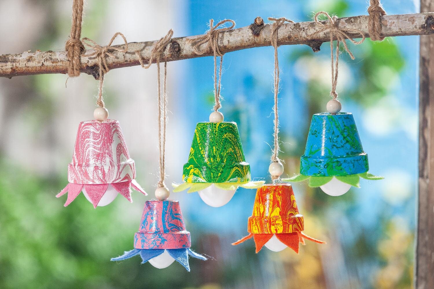 Make simple Terracotta-pots into little colourful flowers to hang up! The pots are marbled. The bellflowers provide colour in the home and outside in the garden on the still bare branch.