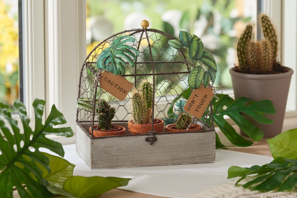 Also design the bottom of the aviary with napkin technique: lightly prime, coat with napkin varnish and then apply the napkin motif. Attach the embossed leaves to and inside the aviary with hot glue.