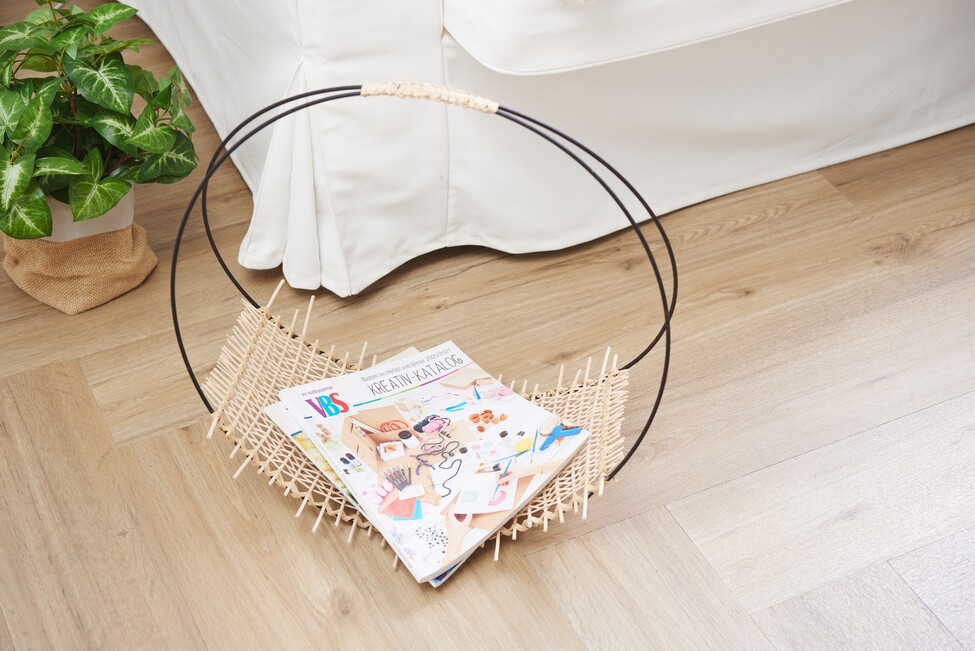Handle: For the handle, connect the metal rings with the square knot (macramé). You can find instructions with all the common macramé knots under Ideas & Instructions no.: 2154. For this, use the raffia, but be careful not to pull it too tightly as it could tear.