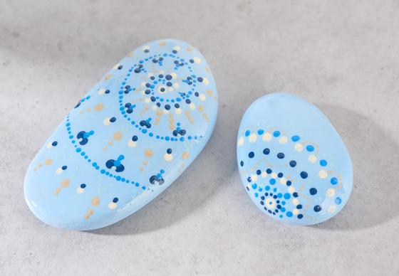 Round wooden sticks are used for the actual dot painting: simply dip the round tip in paint and then apply dots - here in wavy lines. The different wood stick thicknesses result in different dot thicknesses.
