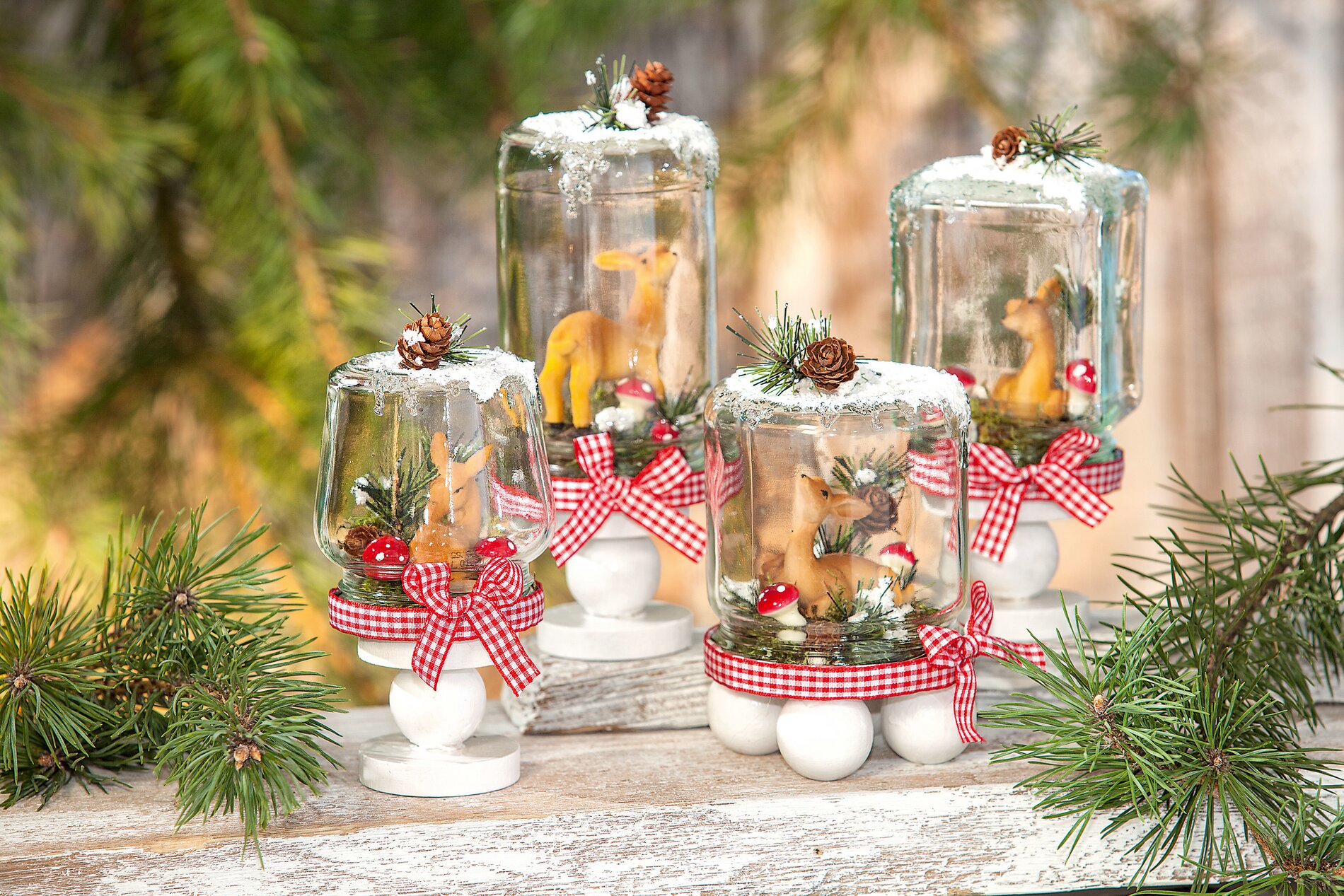 The jars are screwed onto the lids, with tape,-Ribbon checkered ribbon with tape is stuck around-Ribbon the edges of the lid and decorated with a bow. Pour decorative snow on the glasses, decorate with further icicle medium and put small decorative mini accessories on the decorative snow.