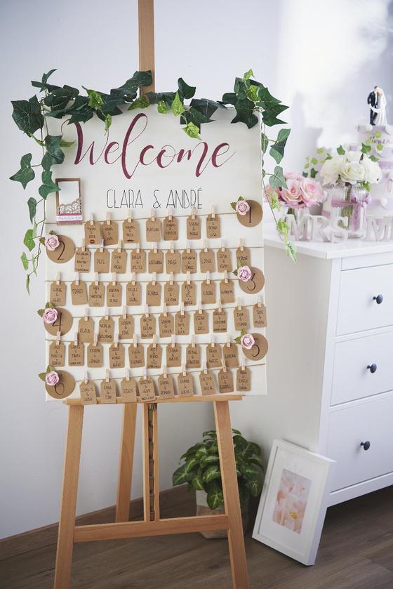 So that every guest feels comfortable at your dream wedding, plan the seating arrangements in advance. This great standing decoration helps your guests to find their way around the wedding.