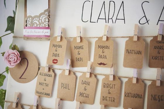 Label the gift tags with the names of your guests. Small drawings like kissing mouths, moustaches, dancing shoes and more give the cards something personal. Match the name cards to the tables by Linen clasping them to the tables.