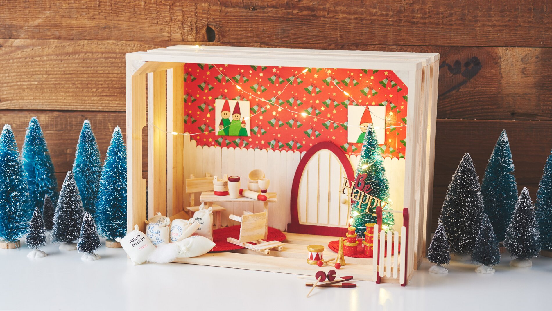 A wooden or fruit crate is used as the "living room". Cover the base with Christmas decopatch paper, which makes a great background wallpaper. Fix this in the crate with a little hot glue.