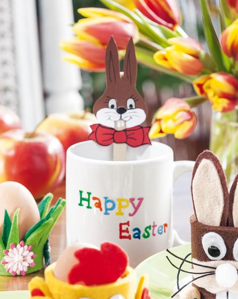 Craft cardboard sheet. The rabbit head is cut out of brown Paper, the mouth part of white Craft cardboard sheet and the bow of red Paper . For the two rabbit teeth simply cut two small white rectangles.