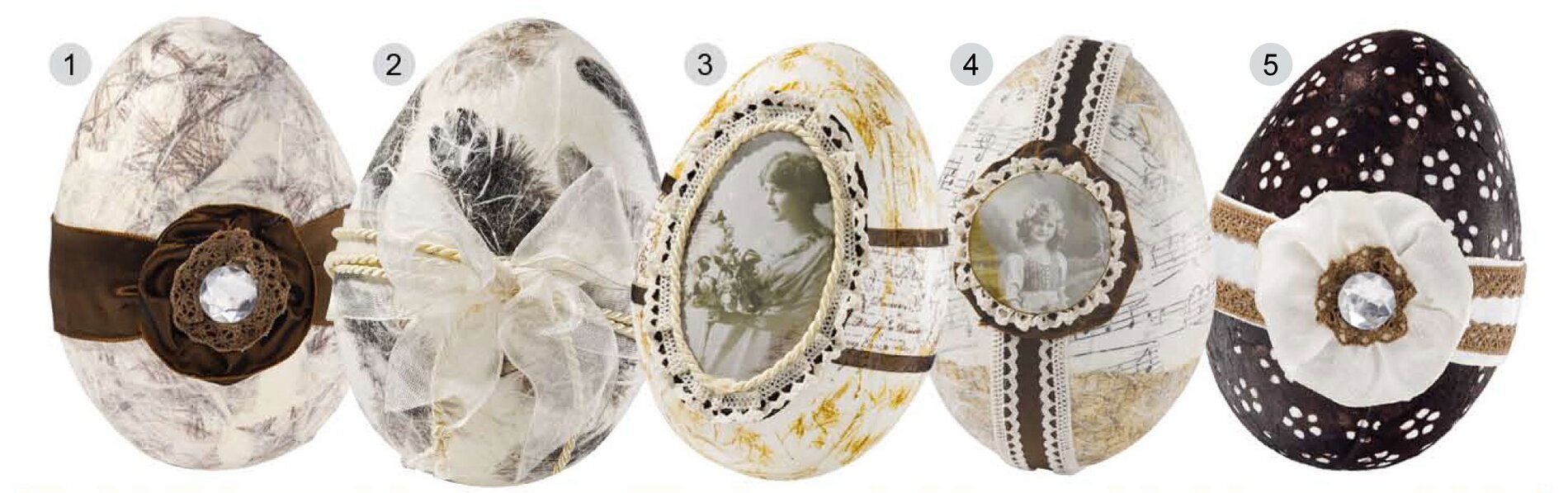 Cut the Natural paper into small pieces and glue it on with Napkins lack. After drying, glue the Acetate ribbon and the tip around the egg. Cut a circle Ø 4 cm out of cardboard, fix the Acetate ribbon in frills with hot glue. Glue on a gemstone and lace, stick the finished rosette in the middle of the border.
