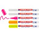 The edding 4095 "Chalk marker"set contains 4 colours. The Marker have a line width of approx. 2 - 3 mm and are suitable for non-permanent design on dark surfaces, glass and mirrors. Also ideal for lettering panels in the entrance area or windows to match the season.