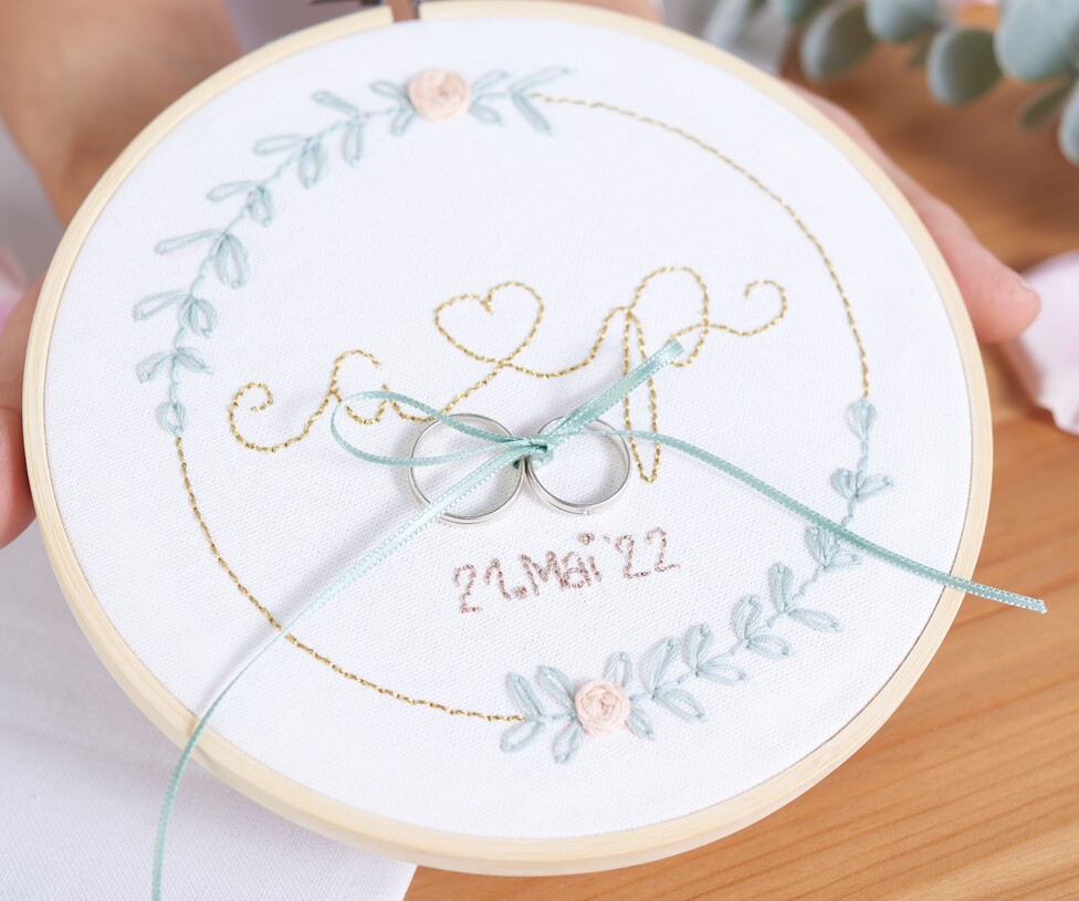 Next, for the lettering, you need to connect the first letters of the bride and groom with a heart and embroider them. The Stroke-Ex pen is helpful here for a neat result. Next, the wedding date is also first prescribed with the Strich-Ex pen and then embroidered.