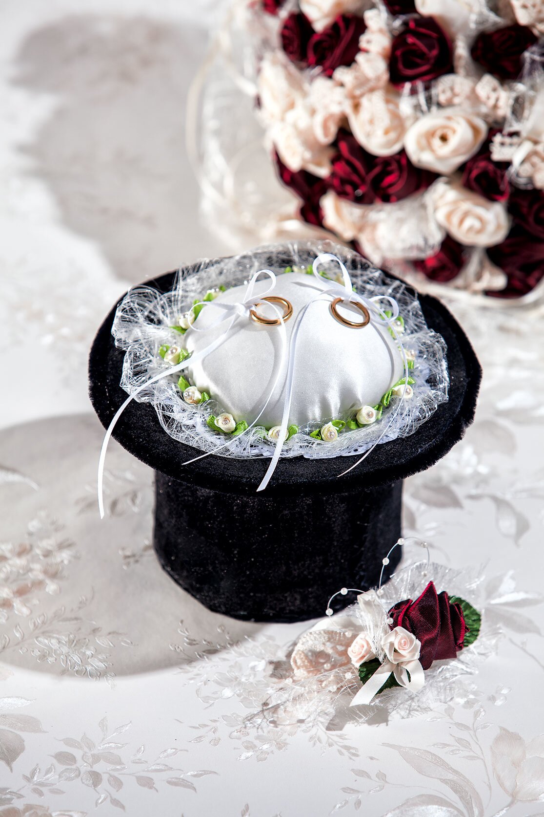 The most important thing on the day of the wedding are the rings. They are safely stored on this extraordinary ring pillow and will certainly not get lost.