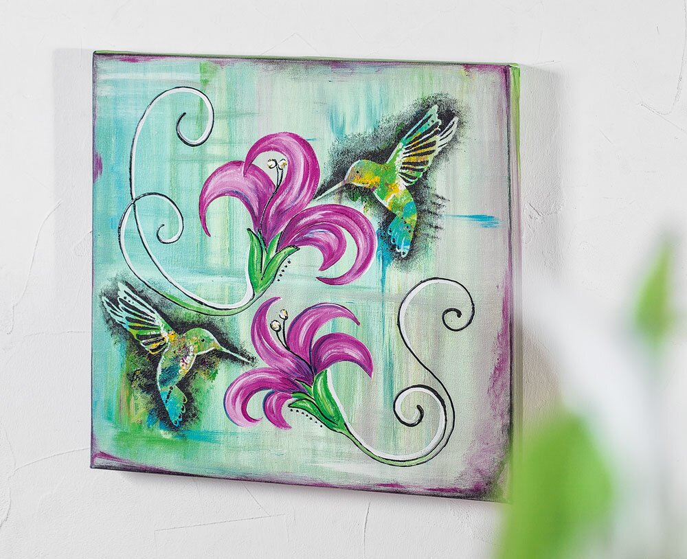 Prime Stretched Canvas in a mixture of white, Magenta, Turquoise and green. Print out the template and transfer the flowers to the Stretched Canvas. Mark the Position the hummingbirds and paint coarse blobs in the pure colours on the spot. The flowers are painted in Magenta and painted green. By brightening the colours, light points can be set and by darkening the colours shades can be incorporated. Emphasize individual areas with the liner, set pistils and points of flowers and apply the curling runners. Fill the pistils in yellow and accentuate the curls with white