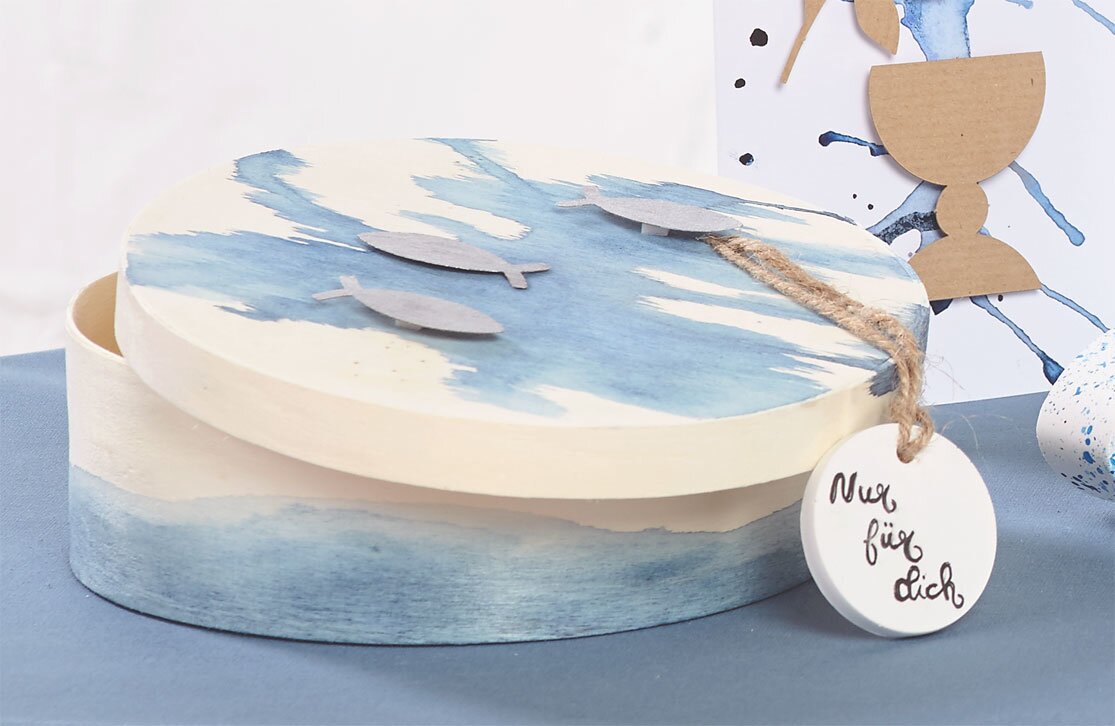 The personal gift will go down particularly well in an attractive Watercolor chip box. For this purpose, the box with Watercolour painted and then simply decorated with something and Jute ribbon accessories