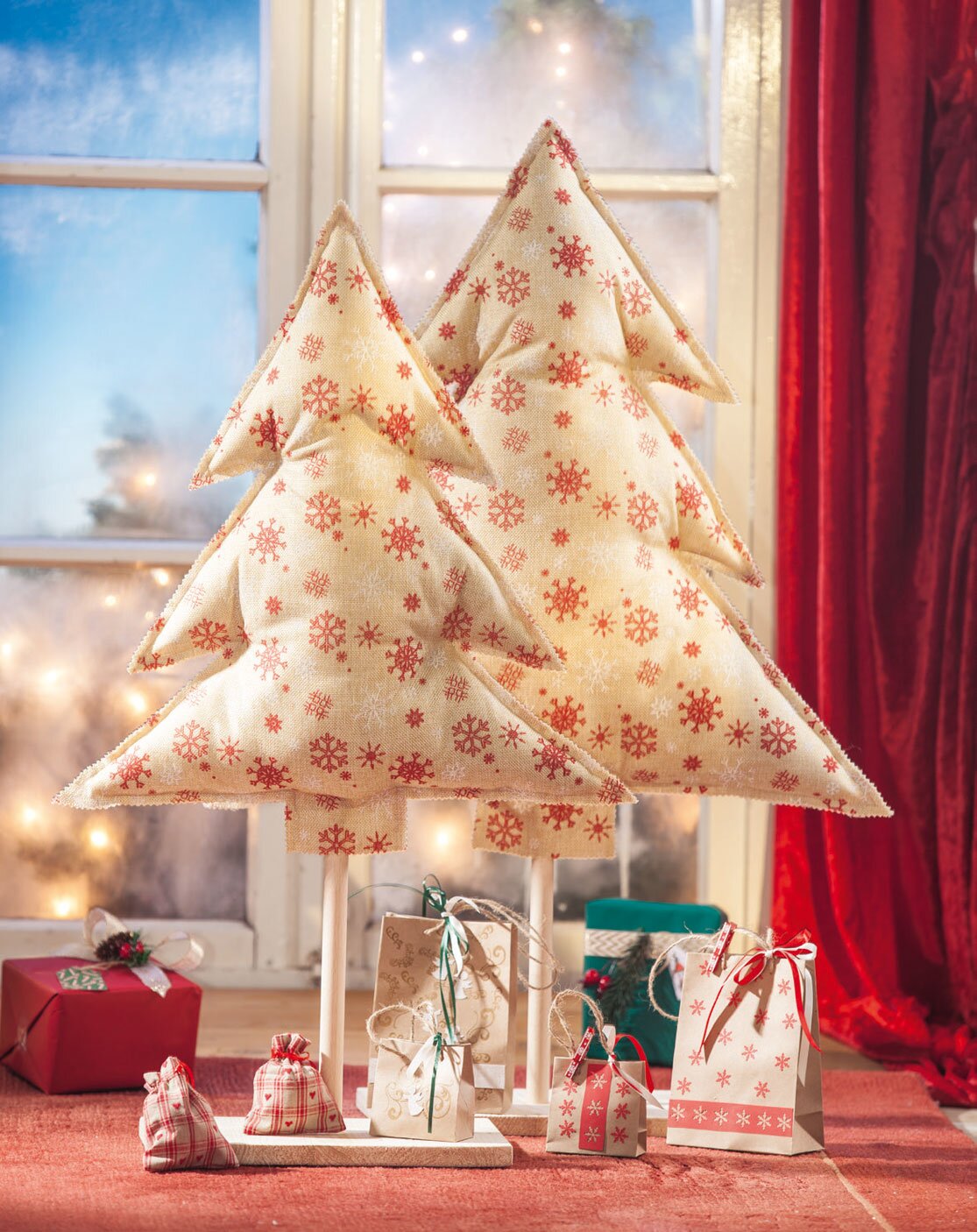 Christmas trees sewn classically from snowflakes-Decoration fabric also look beautiful. In a smaller version they are a great Christmas decoration on the table or in the window.
