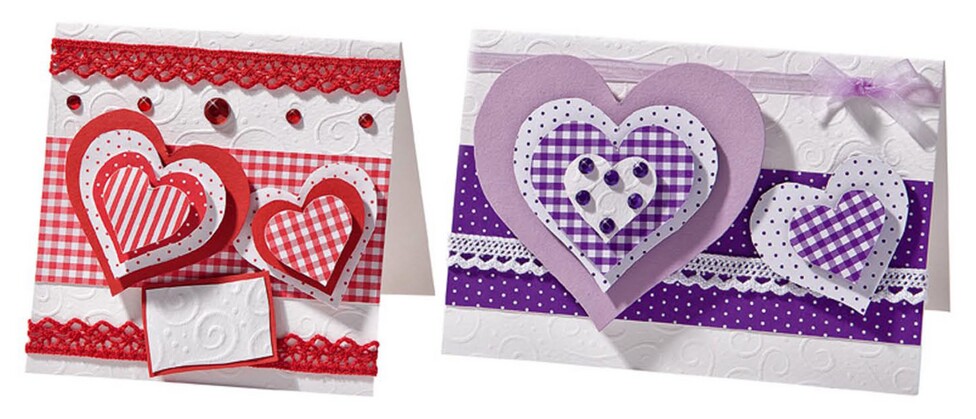 In the next step, you transfer the hearts from template sheet to various papers and then cut them out. With 3D adhesive pads you can glue the hearts on top of each other and then stick them on the card