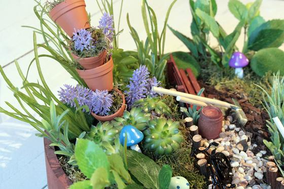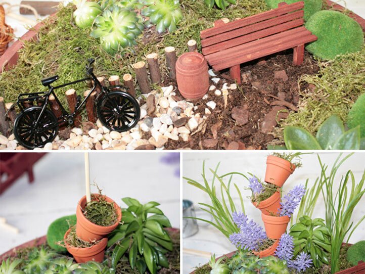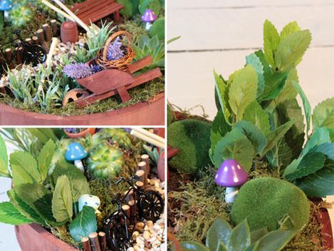 Stack small Terracotta-pots into turrets. They are filled with moss, joined together with a wooden stick and placed in the mini-garden. Then they are simply "planted" with small artificial flowers.