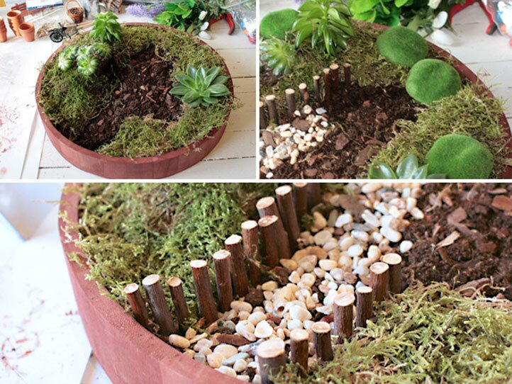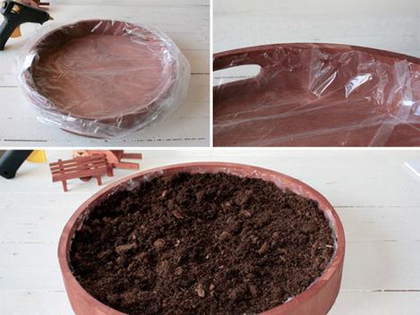 If you use real small green plants, plant them in the potting soil first. Turn the surface of the planting bowl into grass (moss), paths (decorative stones), fences (miniature wooden trunks). Artificial plant green is then placed on the moss