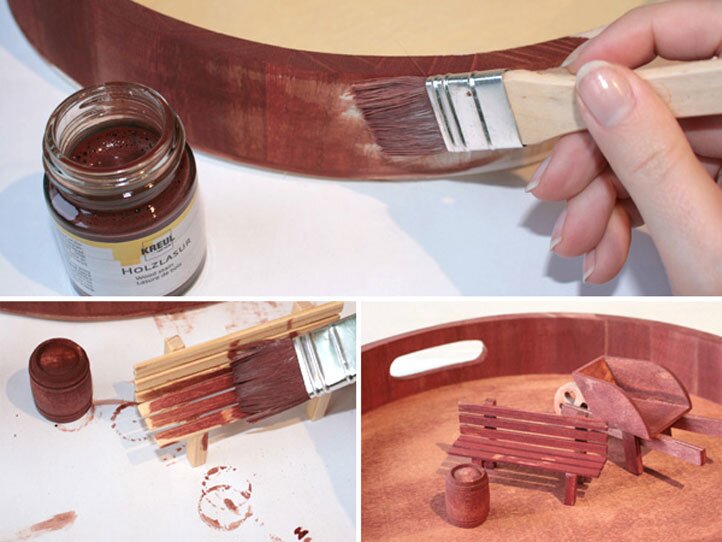 As a first step, coat the tray and Wood Accessories like mini garden bench and keg with Wood stain paint. This will colour the parts without affecting the natural wood look.