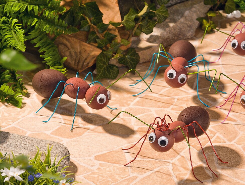 The crafting of ants is really very easy! Polystyrene paint it, put it together with wire, insert legs of wire and glue Wobbly eyes on - done!