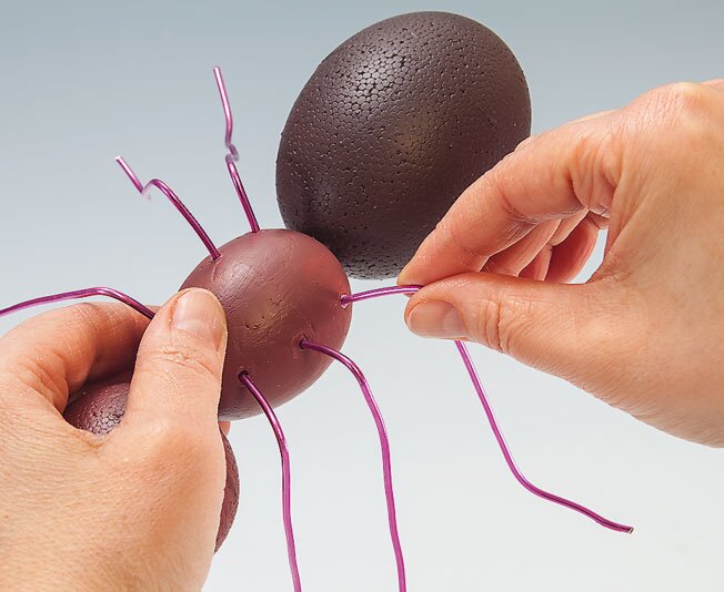 Next, cut 15 cm long pieces of coloured aluminium wire for the legs and the feelers from and bend a hook from it. Pierce holes for the legs in the middle Polystyrene eggs with a wire and add a drop of Handicraft glue . Then you can put the aluminum wires in. To dry the ants, it is best to put them on their back. Afterwards you fix the antennae in the same way and stick the Wobbly eyes on the ants