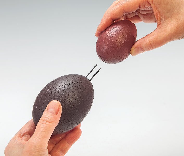 First, you have to prime the Polystyrene-eggs and the bullets. Put them on a wire and paint the big eggs brown, the small eggs and the ball red-brown. To dry them you can put the wires in a tall glass