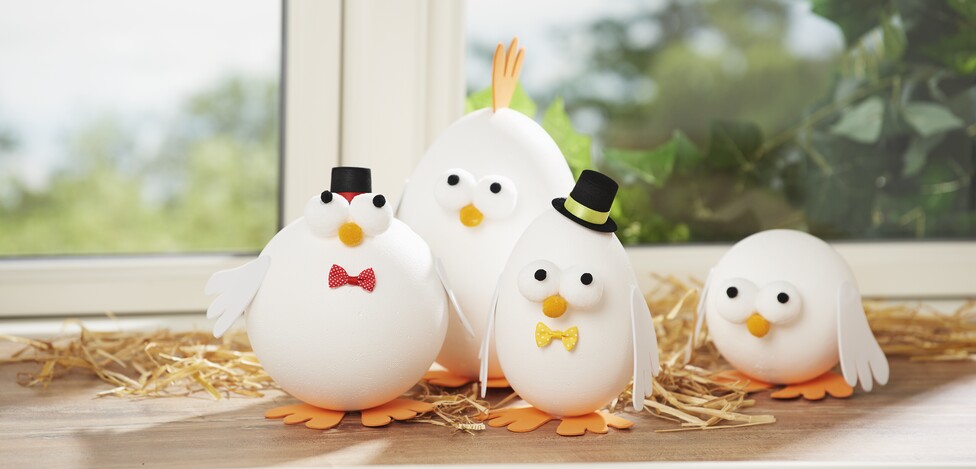 Fasten the eyes, wings, feet and combs to the - or eggs with hot glue. Optionally you can add small details like cylinders and bows as a bow tie with some hot glue