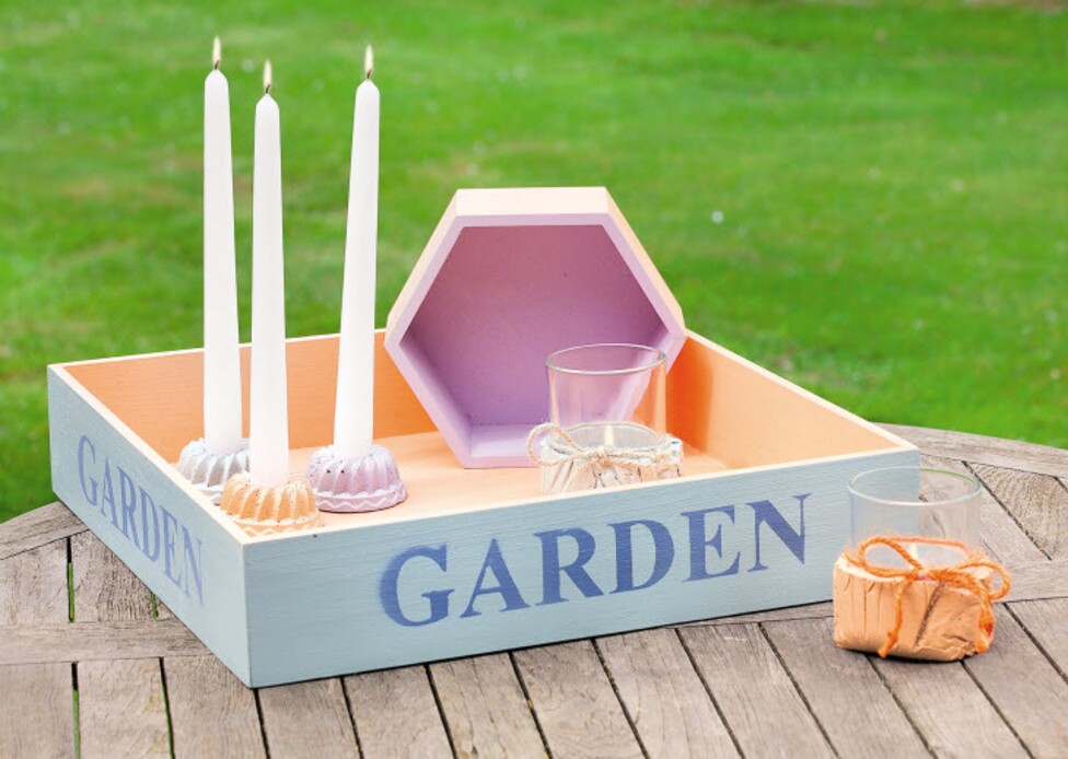 Tray with bowls:Tape the insides of the bowls and tray and spray the outside in colour. When the paint is dry, cover the outside of the bowls and tray and spray the inside in a different color. Print out the template and separate the letters with the scalpel, pay attention to the interiors from A; D; R and pick them up neatly cut out. Now spray Stencil on the back with spray glue and place it on the tray, as well as the inner spaces of A; D; R. Cover the free areas outside the lettering with masking tape and newspaper. Now spray the lettering on the tray, let the paint dry and remove the Stencil. To ensure that you can enjoy it for a long time, spray Protective varnish as a finish on your works.