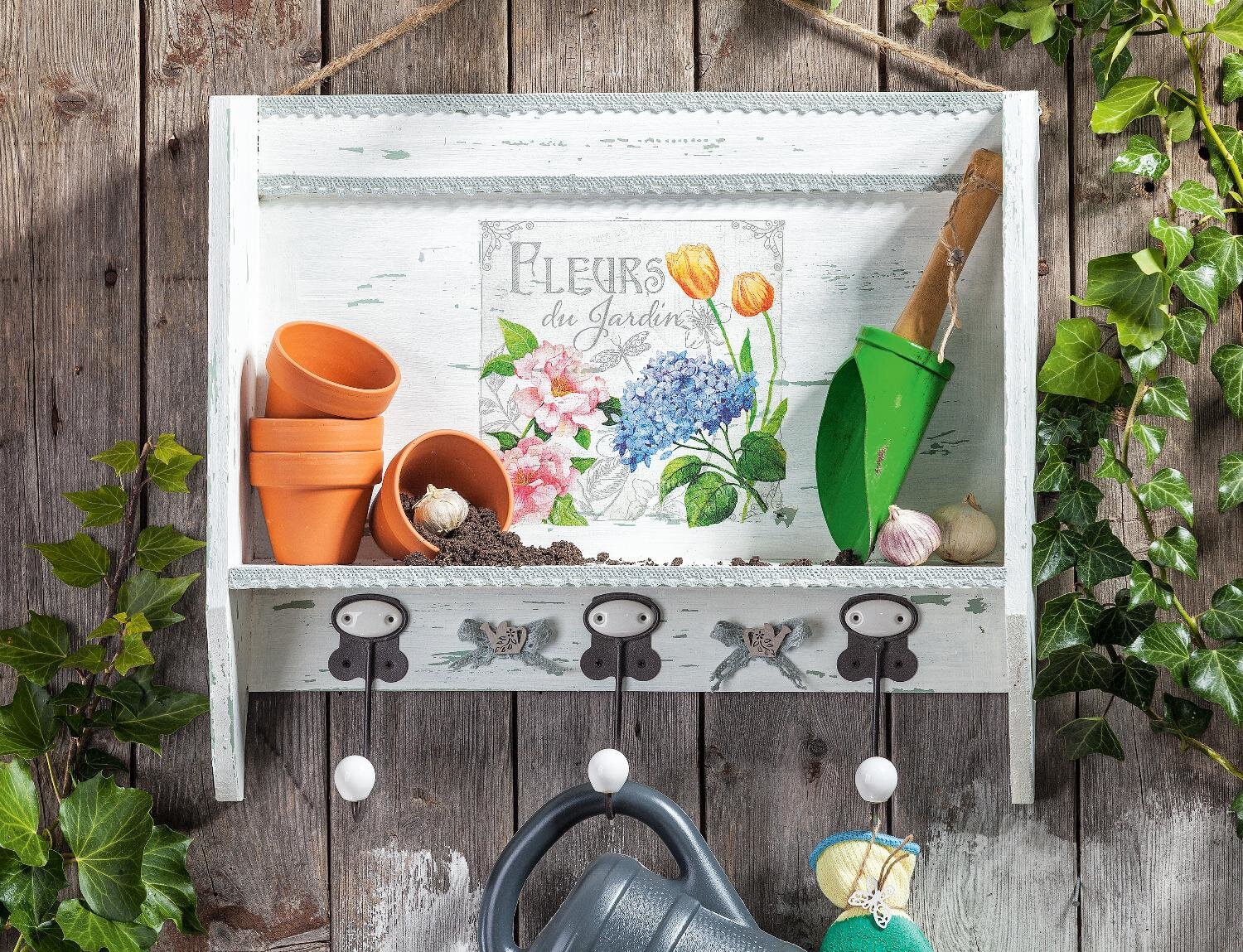 Create order in the garden or on the balcony! The decorative wall shelf is also an absolute eye catcher.