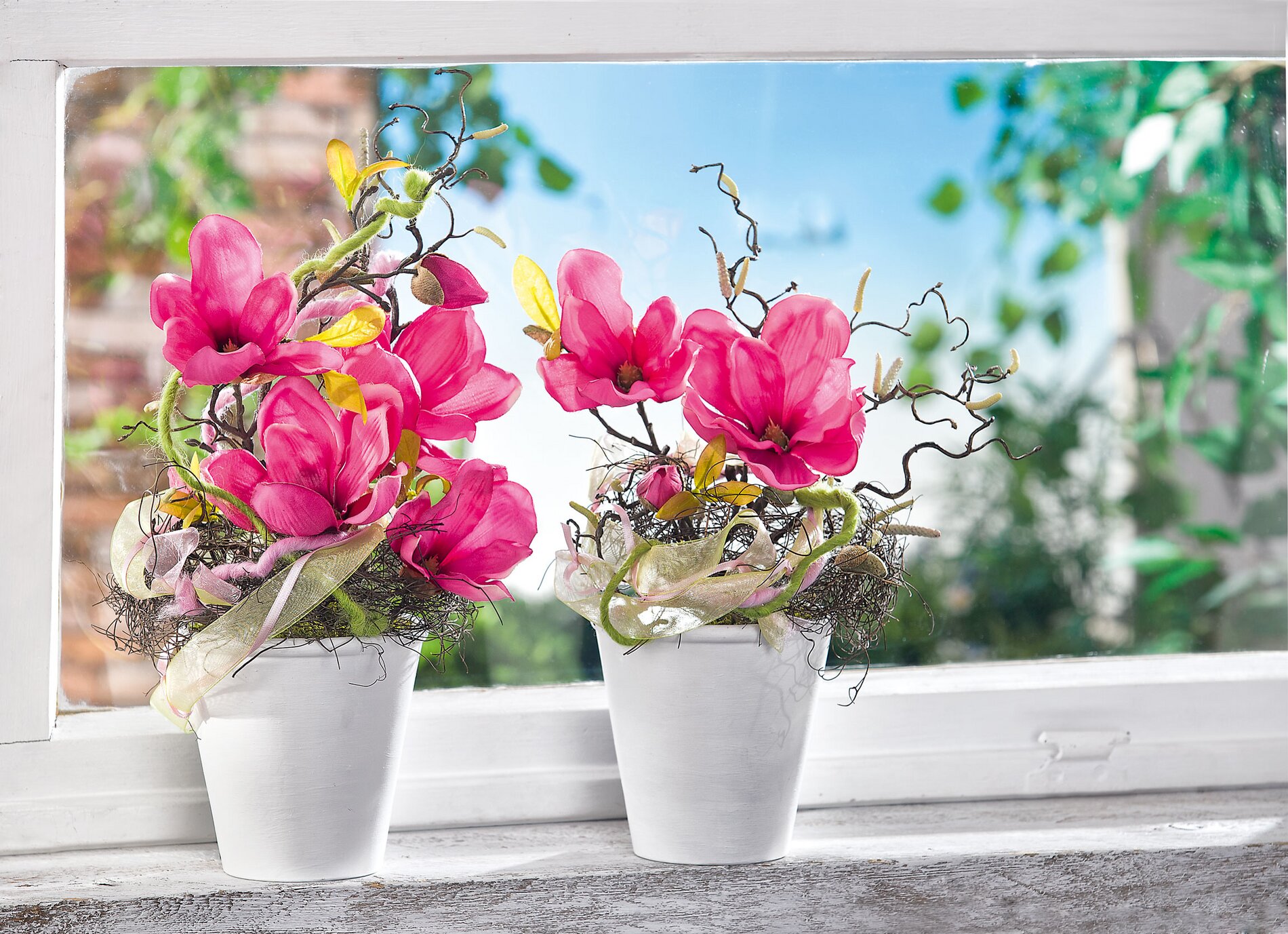 A floristic spring decoration with a signal effect: The pots Terracotta-are deliberately left in white, so that the pink magnolia blossoms have a really big appearance. Decoration-Willow and ribbons in delicate colours are the perfect combination.