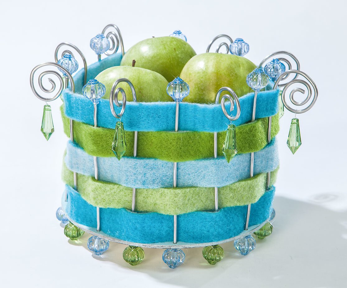 Cut the felt tapes in half lengthwise and weave blue and green alternately through the wire frame, fix the ends with hot glue