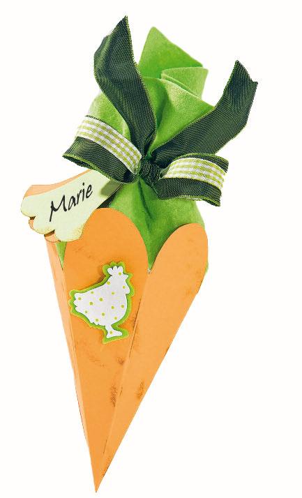 For the decoration, a thick bow is tied from Acetate ribbon and checked ribbon, which is simply stuck on with hot glue. With a flat Ink Pads easily wipe over the Craft cardboard sheet . Thereby the "carrot" looks almost like freshly harvested