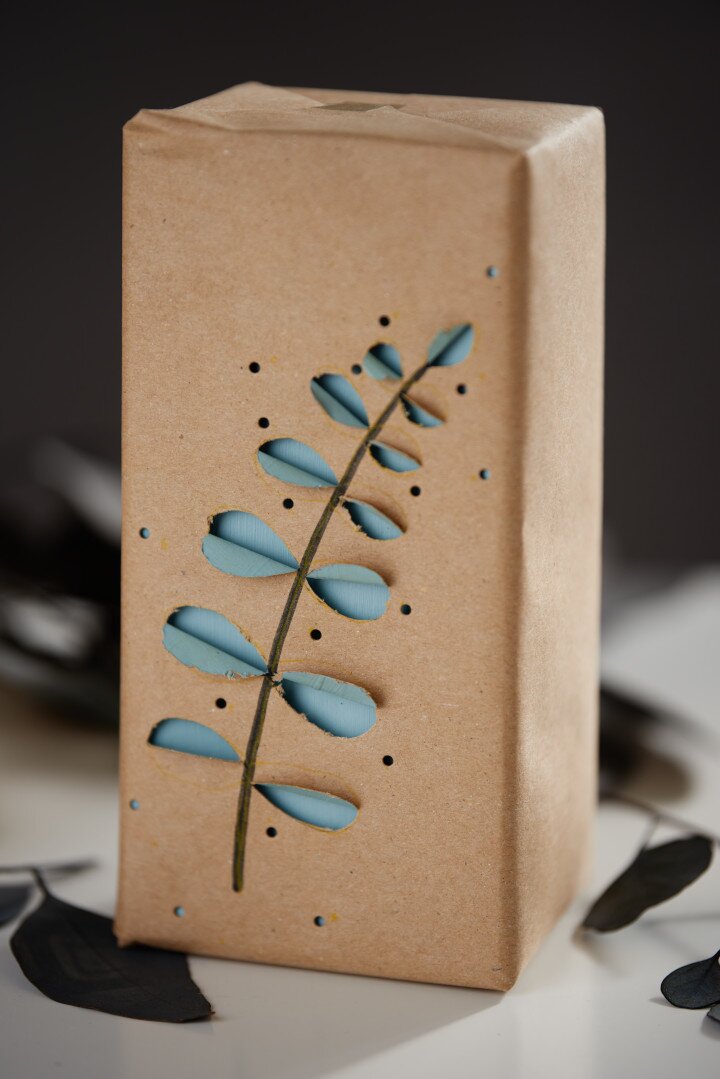 With adhesive tape, you can now wrap your box in the unique wrapping paper. Simply tie another natural jute ribbon as a bow around and bend the cut leaves if necessary still something in shape.