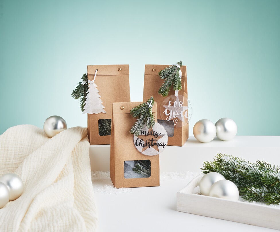 undo the knot of the ribbon from the acrylic-pendant and take small twigs from a fir branch. Tie the small twigs to the gift box together with the acrylic-tag. This will give your packaging not only only a festive but also a natural touch.