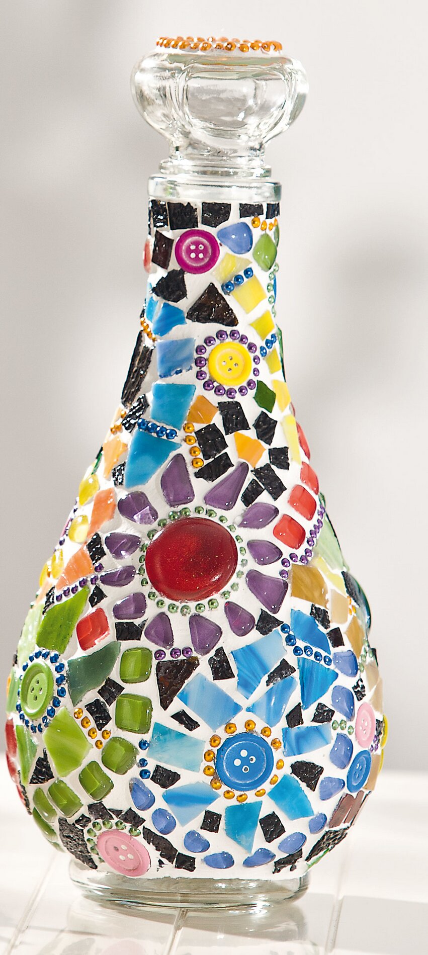 The spaces in between are filled with further mosaic stones, buttons and glass wax beads. The silicone adhesive can be applied directly to Mosaic stones or can be painted onto the bottle with a stirring wood