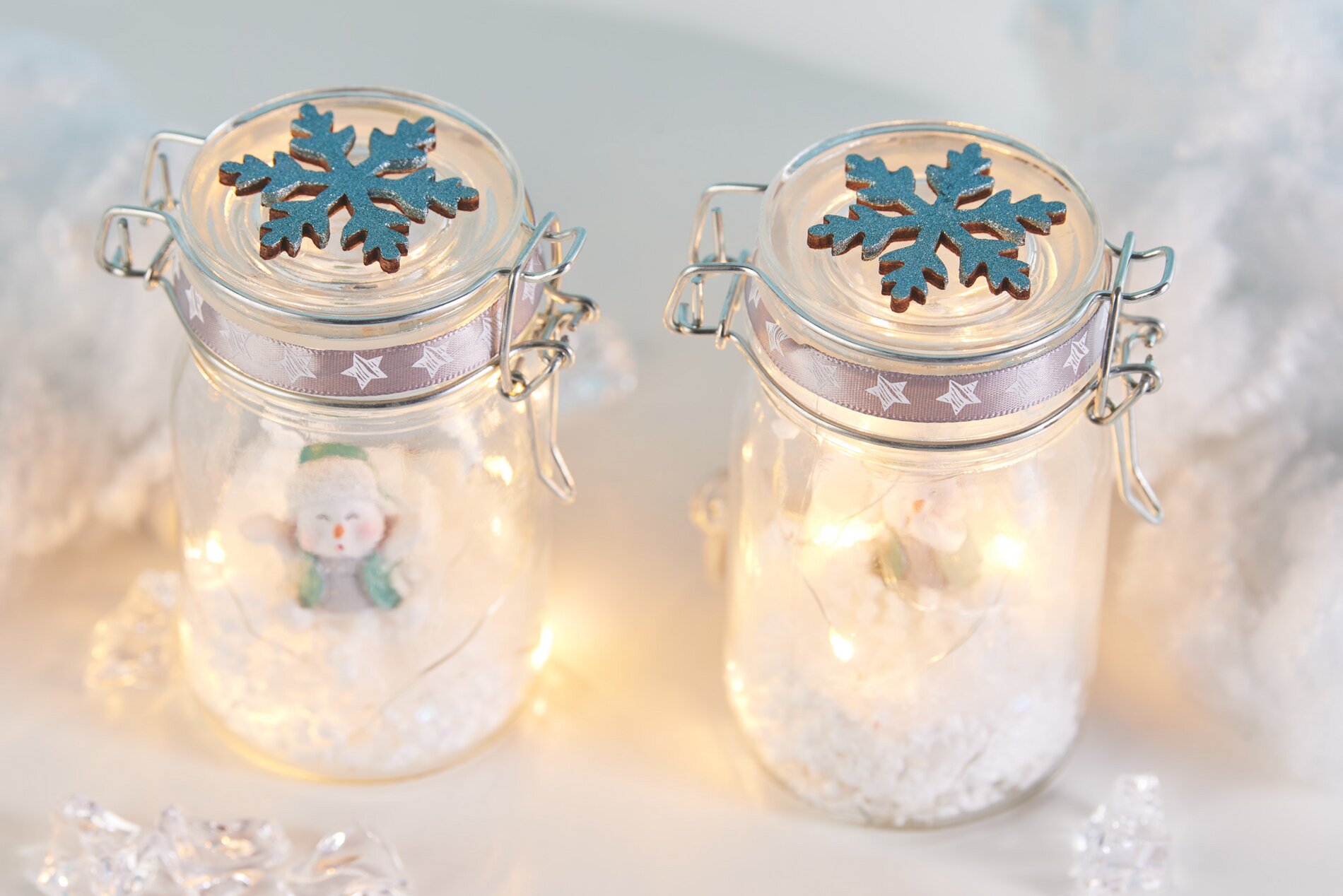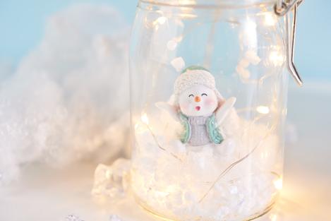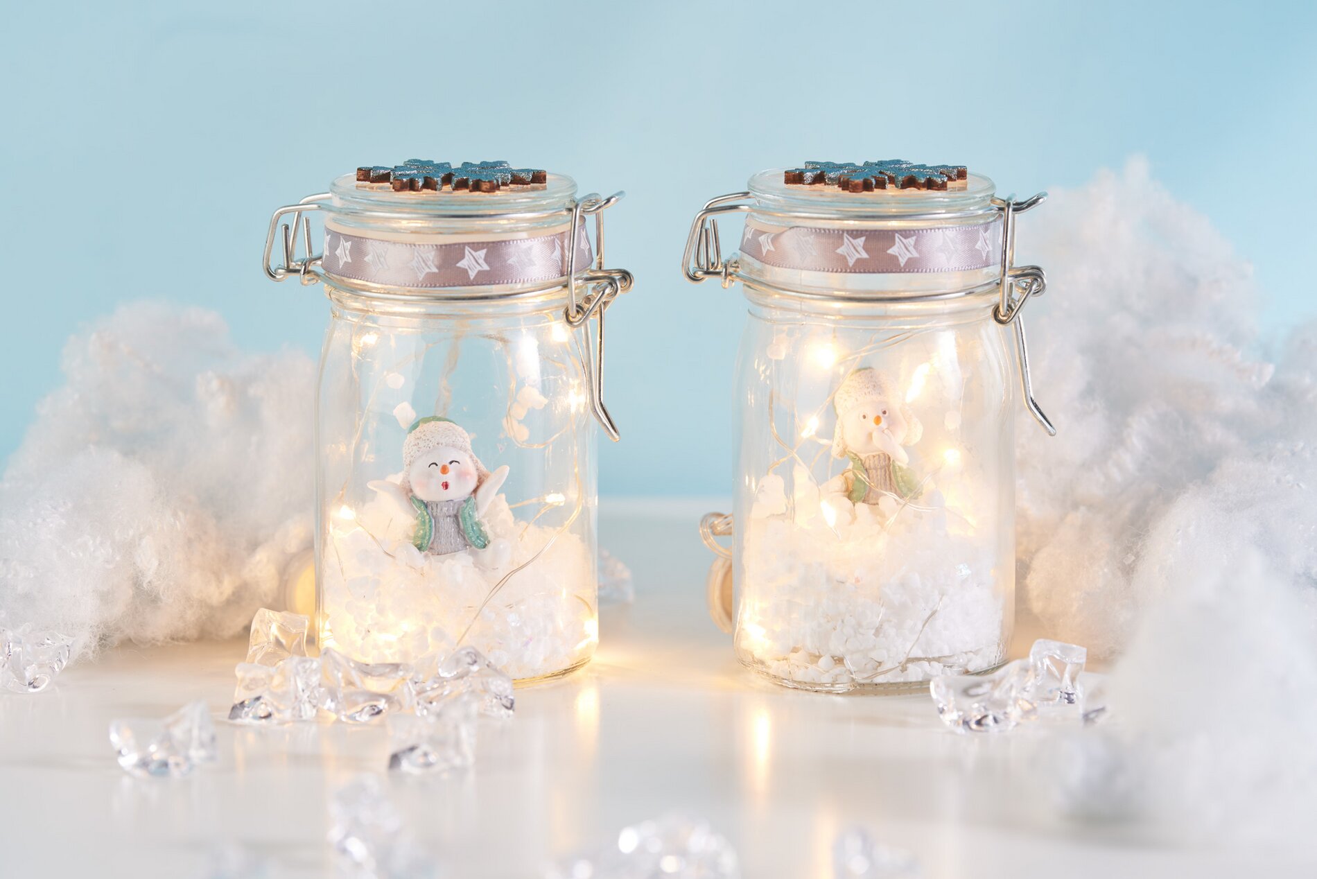 You want the snow mountain in the glass to be higher? More styrofoam can be worked on as desired, small styrofoam flakes are suitable for decorative snow. The small snowman or a similar miniature figure of your choice (the size of the figure should harmonize with the size of the storage jar) is now glued to the snow mountain.