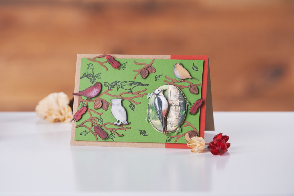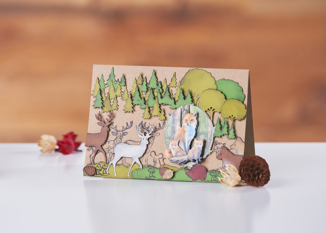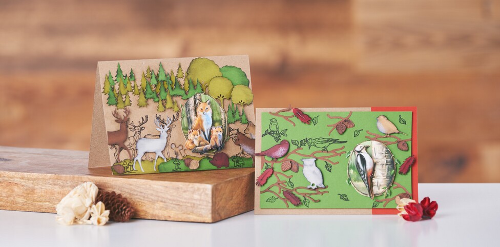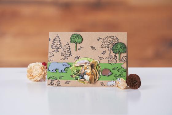 Use the motifs of the silicone stamp "Forest animals". Stamp the little trees on green paper, foxes and hedgehogs on brown, then simply cut out these motifs for sticking on the cards. Or stamp directly onto the greeting cards - according to your personal taste.