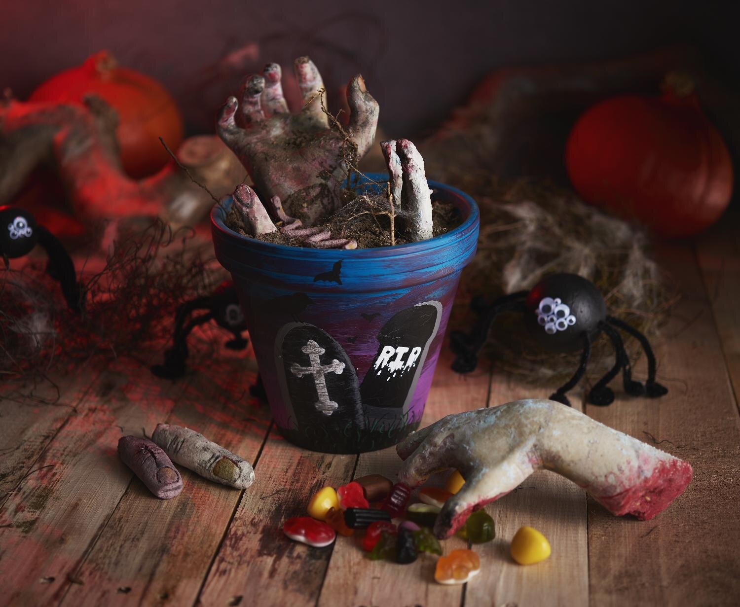 After drying, the Terracotta pot will be displayed with Flower arrangement foam filled. The Flower arrangement foam is covered with earth. Spread some glue on some parts of the concrete arm and fingers and dip them into the earth. Finally put the creepy hand and creepy finder into the pot.