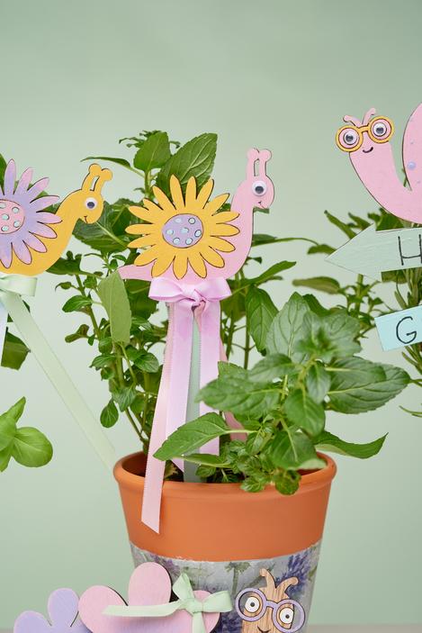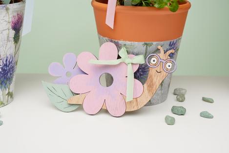 From the wooden pendant "Snail Willi", however, now remove the ribbons, because this is placed in the herb pot scene as a decoration. Paint this snail, flower and leaf and glue the three parts together decoratively. You are welcome to glue a small crafted bow to the little flower.