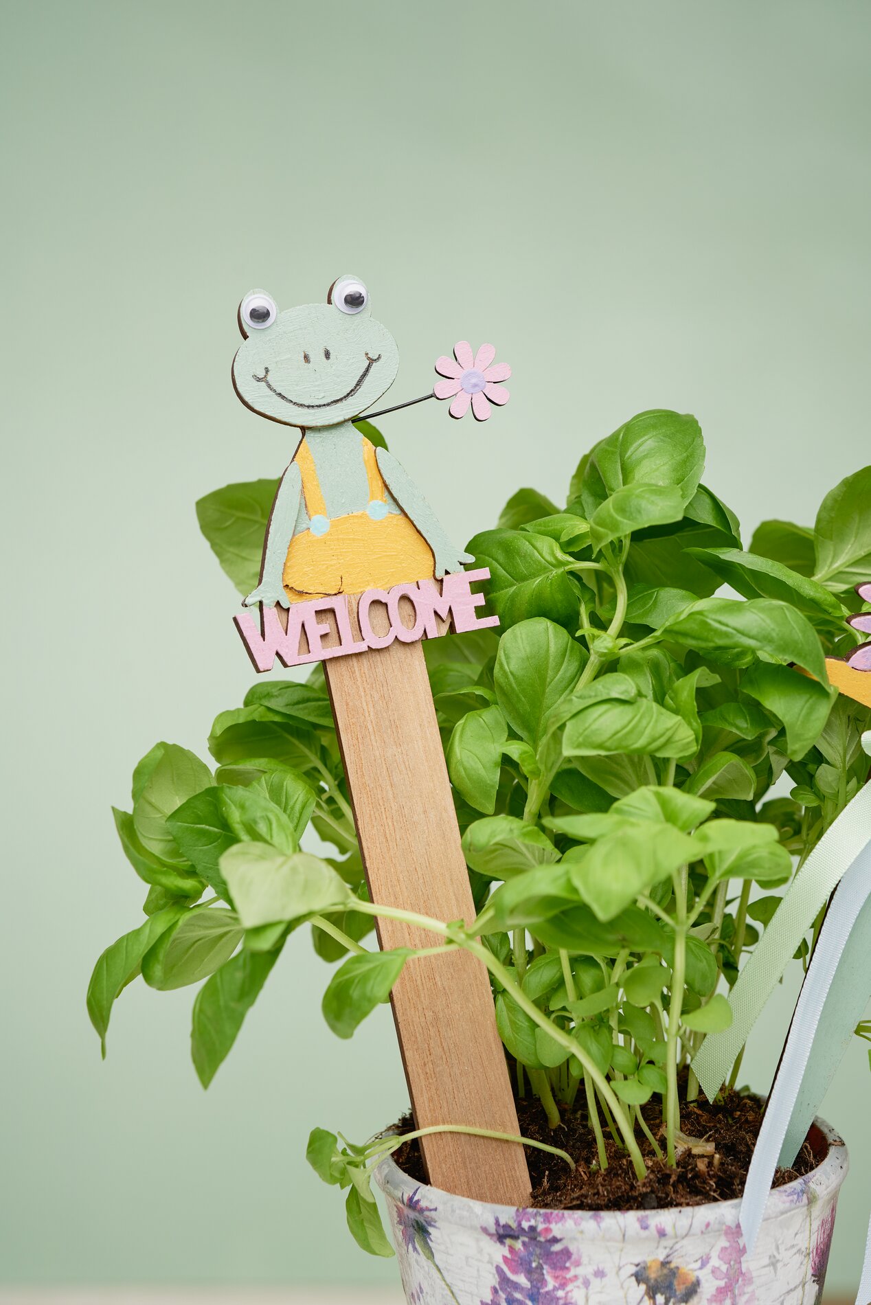 Paint the individual plugs with colors from the "Pastel Poetry" set. Trace the contours of the laser-cut faces with a fine-tip marker and label Lizzy the snail's tags with "Herb" and "Garden" or your own personal message.