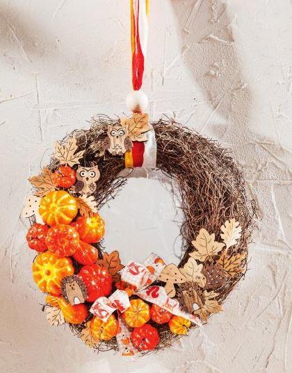 First of all a suspension belt is attached to the wreath. Cut 3 plain satin ribbons of equal length, place them around the wreath and thread the ribbons through the hole of the Wooden ball. Knotted together, the wreath can be hung up and optimally decorated.
