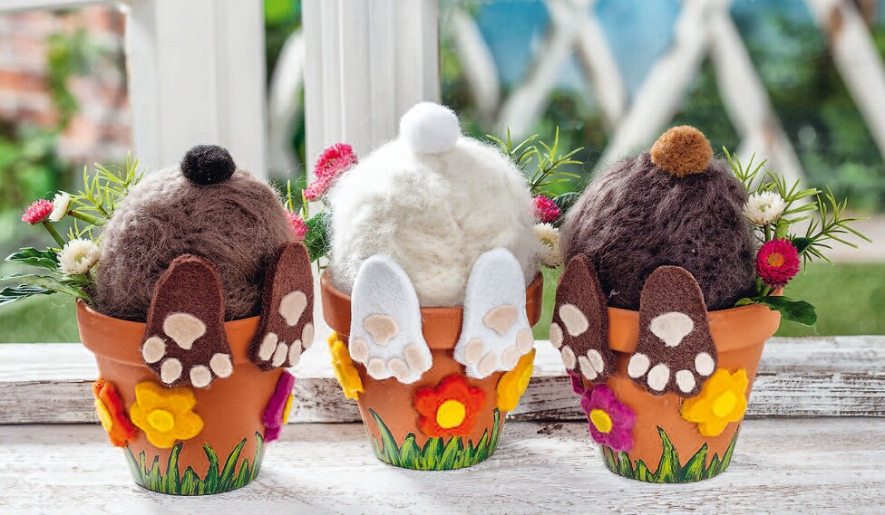 The cute bunnies, which are upside down in the small Terracotta-pots, can also stand on the windowsill before Easter. They consist of Polystyrene-eggs, which are felted with fairy tale wool. Paws and flowers are cut out of coloured Felt sheets and glued on.