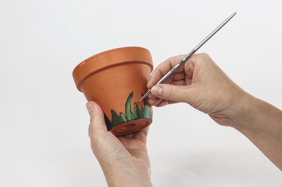 Now the grass is Terracottapainted around the pots with a fine brush in different shades of green. To ensure that the felted egg is well fixed in the terracotta, it is advisable to place small pieces of dry paste in the bottom of the pots.