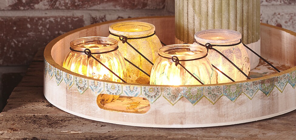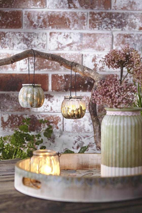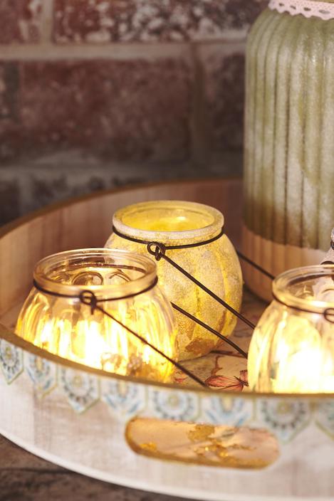 The small trendy grooved lights are first dabbed with glass-effect gel. As soon as the paint has dried, the jars are decorated with straw silk shreds and porcelain pens or with Leaf metal further
