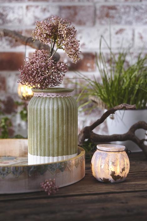 On the glass vase with grooves, color is applied with a sponge glass design color. The great wipe look on the vase is created by first priming all surfaces in green colour and then dabbing and wiping in the still moist antique white colour.
