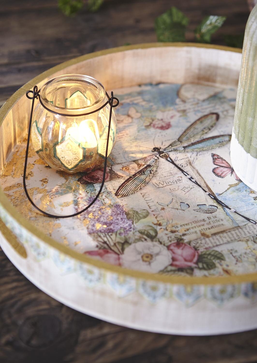 Position the motif parts before sticking them on the dried tray and stick each part of the motif straw silk to the tray using decoupage glue and a soft brush. Any excess paper can be easily cut off with a scalpel