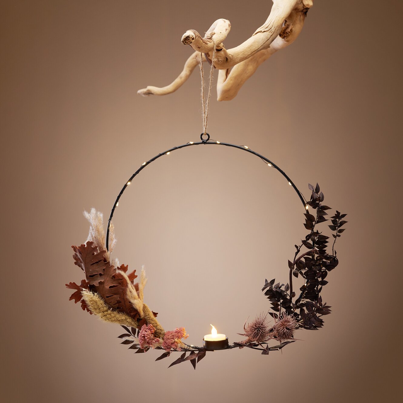 Now arrange dried flowers on both sides of the tealight spout in the lower half by tying them to the metal ring with binding wire. Use natural flowers according to your personal taste.