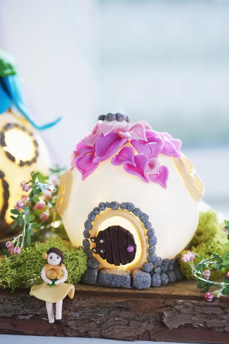 Modelling Now put the roof on the ball. We have decided to use petals. With the one fairy house we made small leaves and then pressed them firmly, with our blue roof we made a flower and put it on the ball as a roof.