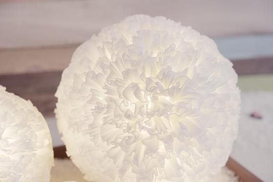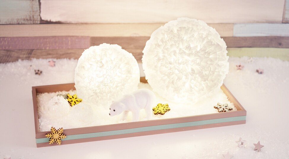 The acrylic hemispheres are gradually pasted with the paper squares. Once they are completely covered with the crepe paper, a string of lights is placed in each of the spheres, the timer action on the lights is activated, and finally the spheres are closed.